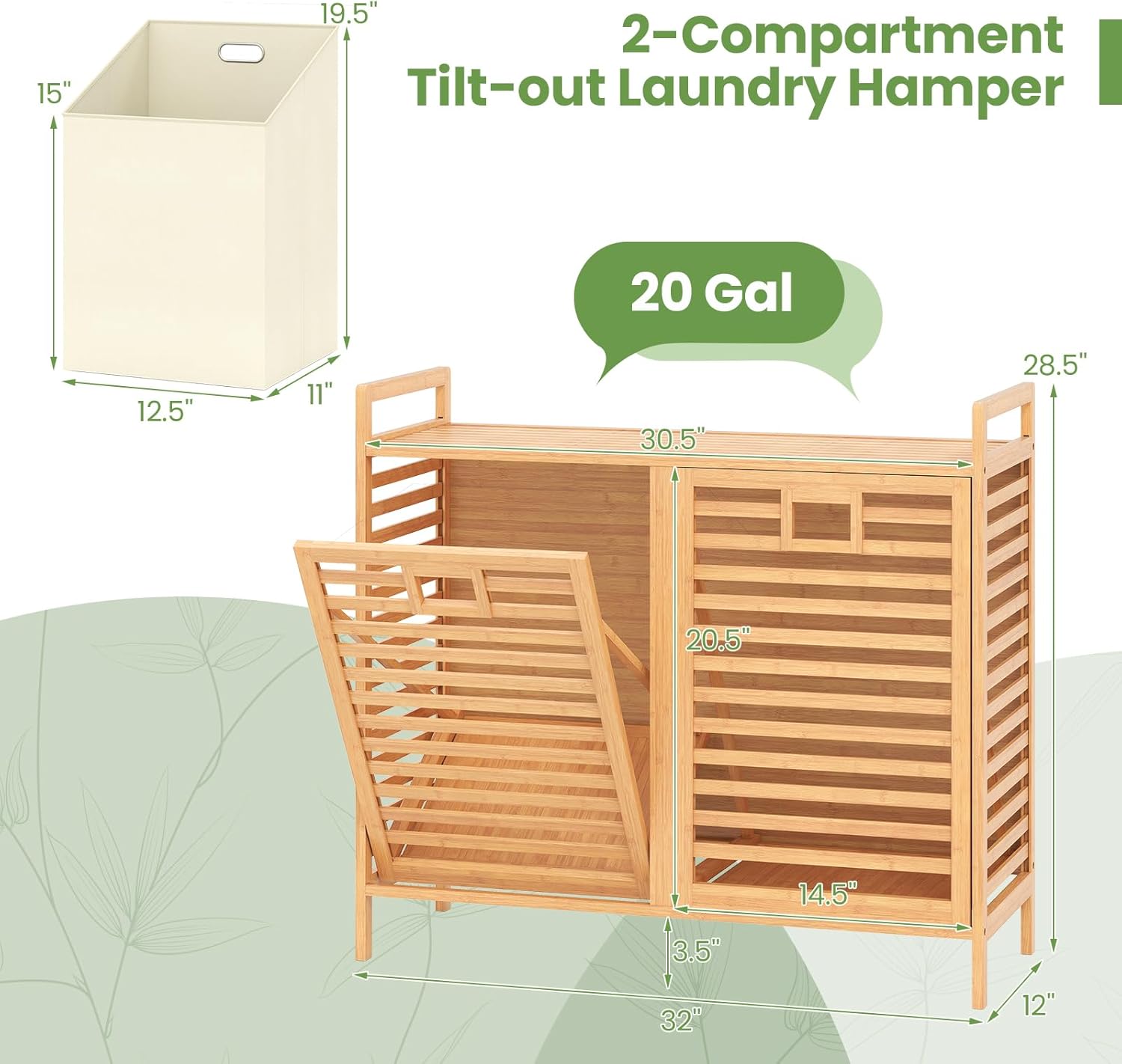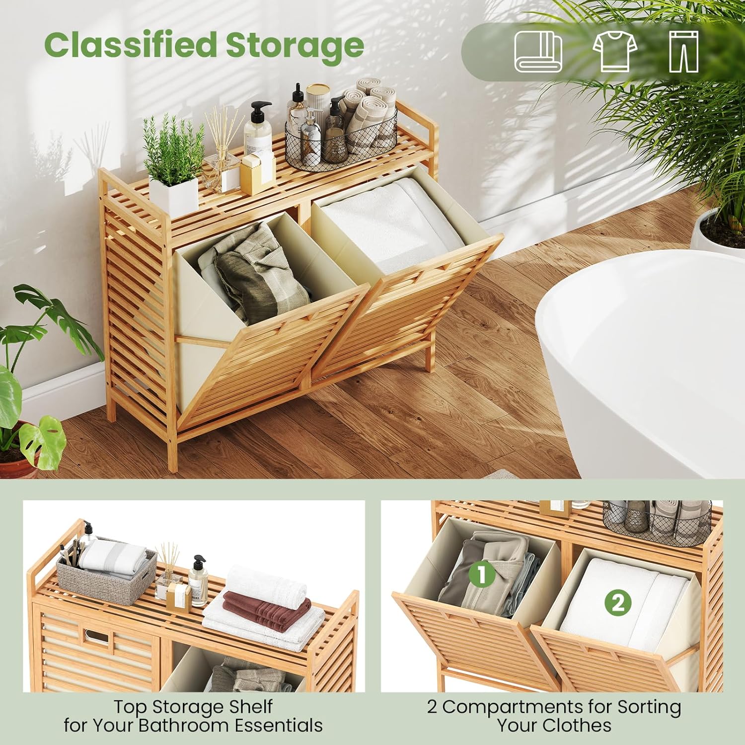 Giantex Tilt Out Laundry Hamper, 20 Gal Bamboo Laundry Storage Cabinet with 2 Removable & Foldable Fabric Bins, Top Shelf, Pull Out Laundry Basket Organizer for Bathroom, Living Room, Bedroom