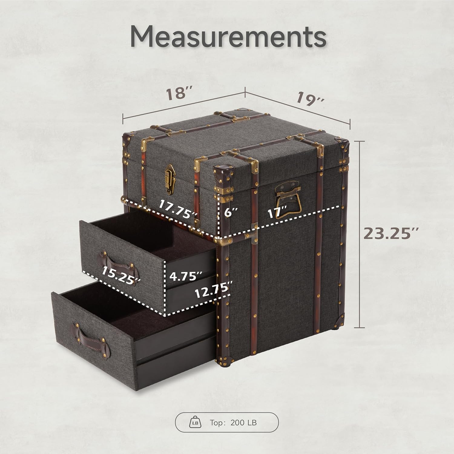 Vintage Storage Chest with Buckle Hinged Top, Linen Accent End Side Table for Living Room, Office, Bedroom, Rectangle, Grey